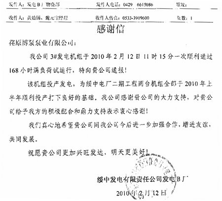 2009年9月27日8時(shí),海門(mén)一期4 *1000MW國(guó)產(chǎn)臨界機(jī)組,#2機(jī)圓滿(mǎn)完成了168小時(shí)滿(mǎn)負(fù)荷運(yùn)行,順利投產(chǎn)發(fā)電。海門(mén)電廠(chǎng)特地為我公司發(fā)來(lái)感謝函,對(duì)我公司的優(yōu)良服務(wù)表示感謝。海門(mén)一期4 *1