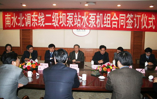 3月12日,南水北調(diào)東線一期工程二級壩泵站簽字儀式在山東省濟(jì)南頤正大廈隆重舉行;山東省水利廳領(lǐng)導(dǎo)、淄博市領(lǐng)導(dǎo)及荏原博泵李正民副總帶隊(duì)參加了簽字儀式。荏原博泵在南水北調(diào)主線泵站中標(biāo),標(biāo)志著我公司大型泵的制造將有新的突破。
